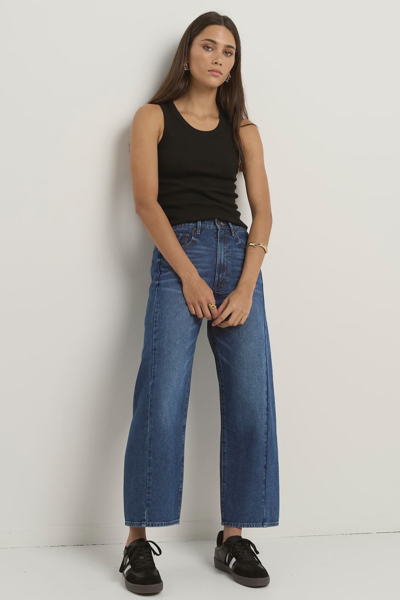 The much anticipated Varsity Deep Blue Jean is your go-to for cool, confident dressing with a polished twist. Cut in a flattering mid rise with a barrel leg, gentle tapering to the ankle and slightly cropped length, these jeans are the epitome of relaxed chic. Crafted in crisp deep blue denim that gets better with age, they’re made to pair effortlessly with everything from tanks and tees to blazers and boots.