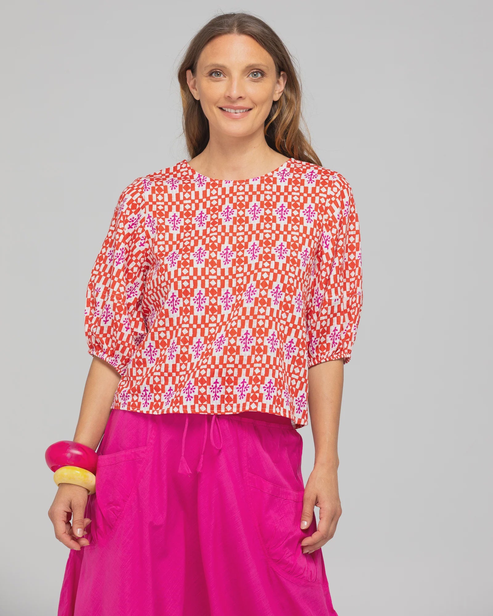 The Boom Shankar Ava Top is your new essential! This slightly cropped top in 100% cotton is comfortable and easy-to-wear throughout the seasons. The puff sleeve detail adds a touch of fun to this classic design.