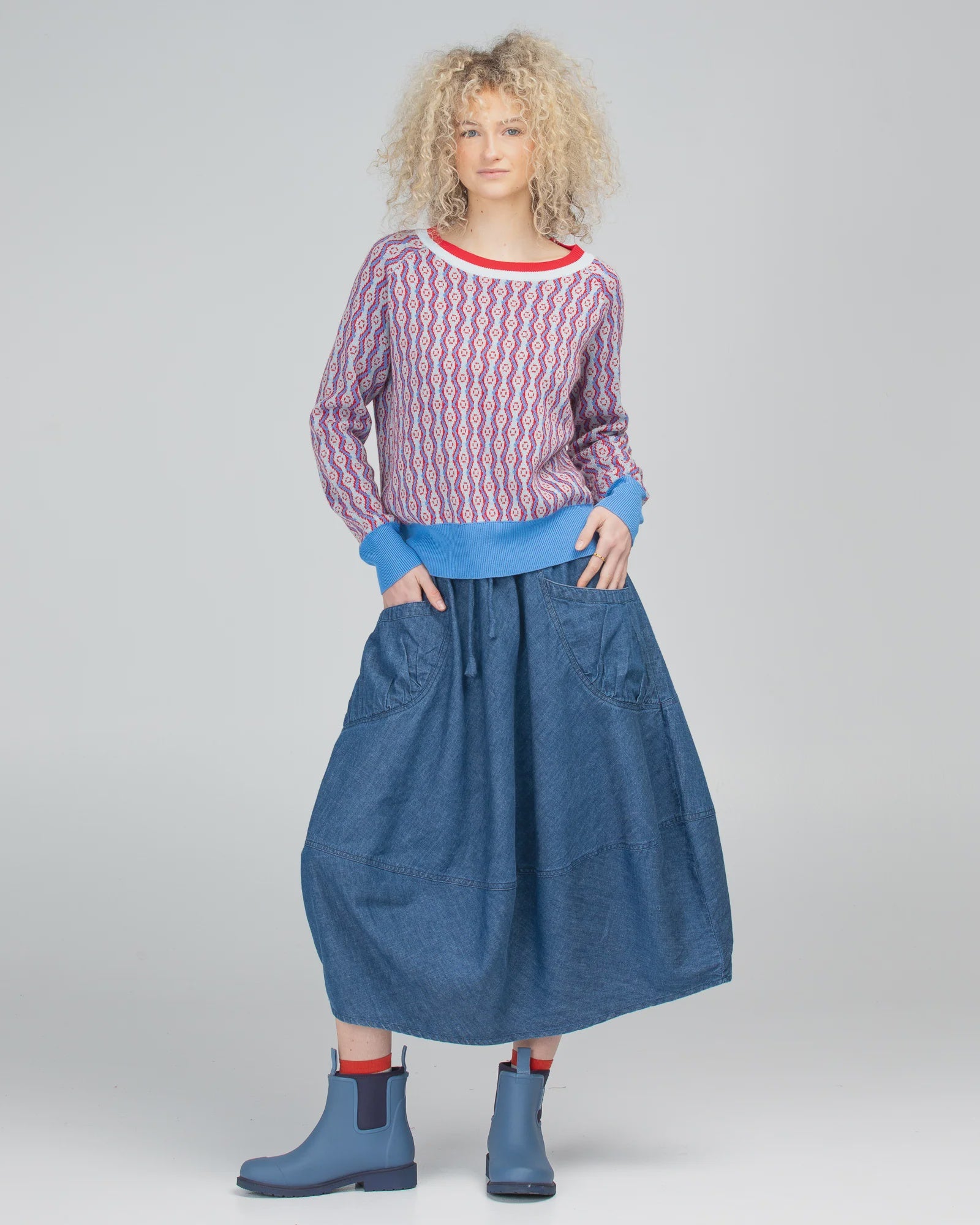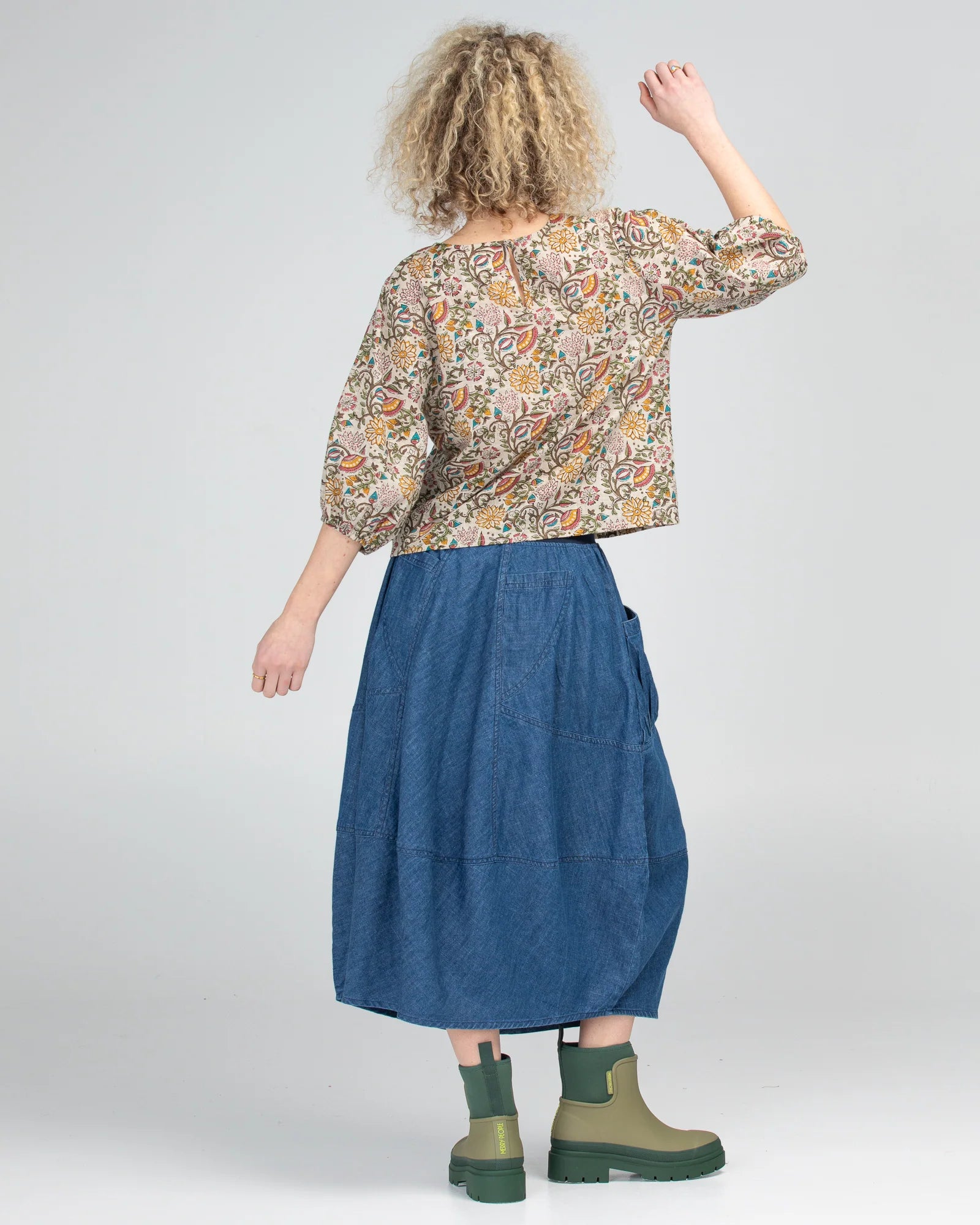 Our bestselling Guru Skirt is now in a mid wash denim! This style is a 3/4 length cotton midi skirt with a super comfortable stretch cotton waistband. The Guru Skirt is an easy-to-wear option for all shapes and sizes.